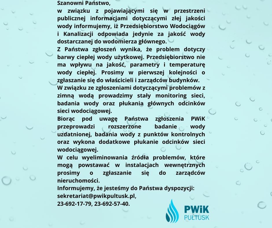 W związku z docierającymi do nas informacjami o żółtawej wodzie w kranach, informujemy, że zjawisko to wynika z prowadzonych napraw awarii sieci wodociągowej w niektórych częściach Pułtuska.